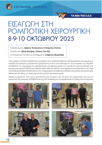 Τρεις ημέρες εντατικής εκπαίδευσης με έμφαση στην πρακτική εξάσκηση ολοκληρώθηκαν επιτυχημένα με εκπαιδευτές έμπειρους ρομποτικούς χειρουργούς (one to one training) στο ISLE Academy της εταιρείας SOFMEDICA. Οι συμμετέχοντες εκπαιδεύτηκαν στη βασική χρήση του ρομπότ (In service training), στις βασικές χειρουργικές δεξιότητες, (Robotic basic skills simulation), στην εφαρμογή των δεξιοτήτων σε ιστικά προπλάσματα (Drylab εκπαίδευση) και στην προχωρημένη εκπαίδευση σε βήματα της ριζικής προστατεκτομής (Αdvanced simulation σε steps ρομποτικής ριζικής προστατεκτομής).