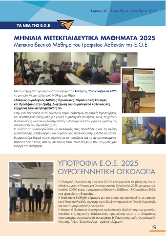 Η Ελληνική Ουρολογική Εταιρεία (Ε.Ο.Ε.) ενημερώνει τα μέλη της ότι οι εξετάσεις για την Υποτροφία Ουρογεννητικής Ογκολογίας 2025, με χρηματικό έπαθλο 12.000 ευρώ, πραγματοποιήθηκαν το Σάββατο, 18 Οκτωβρίου 2025, στα γραφεία της Εταιρείας.