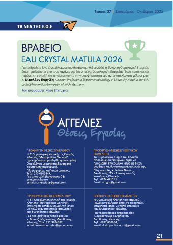 Για το Βραβείο EAU Crystal Matula που θα απονεμηθεί το 2026, η Ελληνική Ουρολογική Εταιρεία, όπως προβλέπεται από τους κανόνες της Ευρωπαϊκής Ουρολογικής Εταιρείας (EAU), προτείνει και παρέχει τη στήριξή της (endorsement), στην υποψηφιότητα του αντεπιστέλλοντος μέλους μας, κ. Νικολάου Πυργίδη, Assistant Professor of Experimental Urology at University Hospital Munich, Ludwig-Maximilian-University, Munich, Germany.