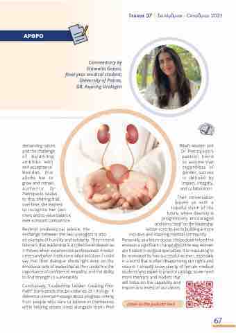 inclusive and inspiring medical community. Personally, as a future doctor, this podcast helped me envision a significant change about the way women are treated in surgical specialties. It is reassuring to be motivated by two successful women, especially in a world that is often disapproving our rights and visions. I already know plenty of female medical students who aspire to practice Urology, so we need more mentors and leaders that