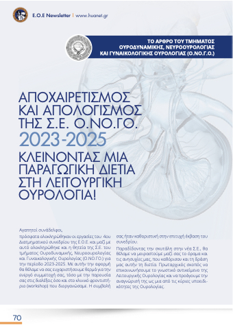 πρόσφατα ολοκληρώθηκαν οι εργασίες του 4ου Διατμηματικού συνεδρίου της Ε.Ο.Ε. και μαζί με αυτό ολοκληρώθηκε και η θητεία της Σ.Ε. του τμήματος Ουροδυναμικής, Νευροουρολογίας και Γυναικολογικής Ουρολογίας (Ο.ΝΟ.ΓΟ.) για την περίοδο 2023-2025. Με αυτήν την αφορμή θα θέλαμε να σας ευχαριστήσουμε θερμά για την ενεργό συμμετοχή σας, τόσο με την παρουσία σας στις διαλέξεις όσο και στο κλινικό φροντιστή- ριο (workshop) που διοργανώσαμε. Η συμβολή
