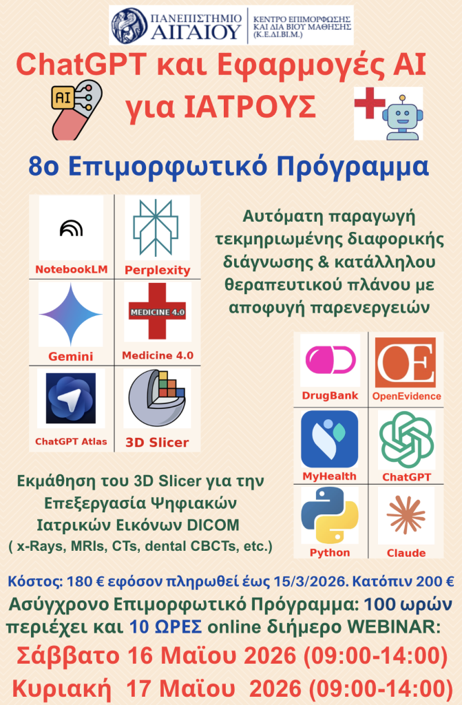 Σας ενημερώνουμε για τη διεξαγωγή του 8ου Επιμορφωτικού Προγράμματος  «ChatGPT και Εφαρμογές ΑΙ για Ιατρούς» του Πανεπιστημίου Αιγαίου, το οποίο θα λάβει χώρα, το Σάββατο 16 και την Κυριακή 19 Μαΐου 2026, τόσο ασύγχρονα, όσο και με online μέθοδο διδασκαλίας (ως Webinar).